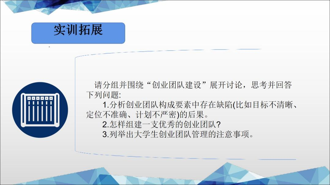 课后拓展要求学生阅读创业团队组建的相关书籍,分小组组建实训团队,进一步丰富知识,开阔视野,增加实践能力。