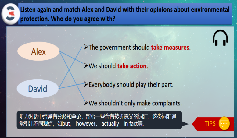 通过讨论引导学生思考个人职业行为对环境的影响,将环保意识与职业道德结合,培养“绿色职场人”。帮助学生树立正确的世界观和价值观,增强环保意识。课后拓展,推送歌曲Earth Song,并交流讨论问题:What is on your mind after watching the video?
