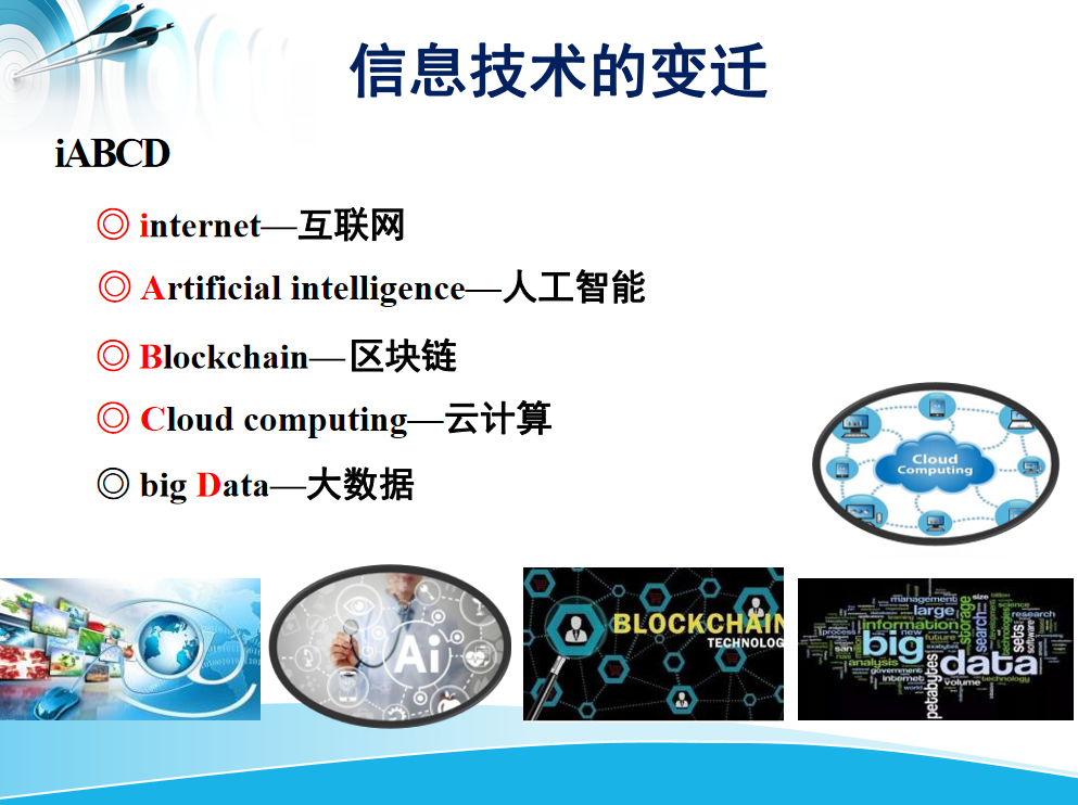从“iABCD”到“互联网+医疗健康”,是一场技术赋能的认识革命。吴老师首先展示了第一张图片——“信息技术的变迁:iABCD”。