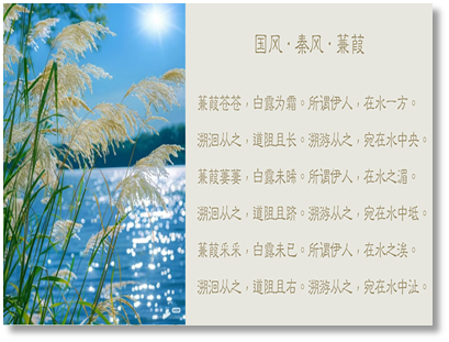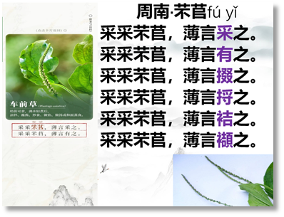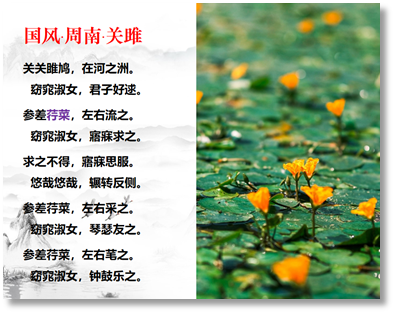 朱立老师首先通过诗经中喜闻乐见的《关雎》《鹿鸣》《蒹葭》等篇章,引导学生学习诗经中常见的重章叠句的手法,它通过反复咏唱来增强诗的音乐性和节奏感,渲染气氛,深化主题,使感情得到淋漓尽致的抒发,让学生体会这种诗经中独特手法的美感。
