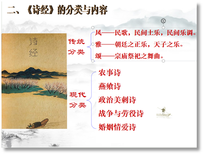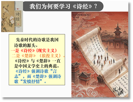 本次课程以《诗经》三首为例,重点通过鉴赏《小雅·采薇》帮助学生了解《诗经》的成书及其风雅颂的编纂体例,全面把握《诗经》的内容和赋比兴的艺术特色,认识《诗经》“感于哀乐,缘事而发,温柔敦厚”的诗教传统。