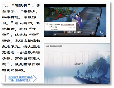 学生从王之涣的“杨柳东风树,近来攀折苦”折柳赠别,到陆游“沈园柳老不飞绵”的以柳怀人,欧阳修“月上柳梢头,人约黄昏后”以柳暗示爱,再到2022年冬奥会闭幕式节目《折柳寄情》,完成了跨越三千年的文化基因解码。