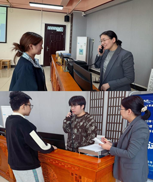 考核环节模拟了真实总机的快节奏环境。学生需连续、独立地处理包括情绪化叫醒、紧急转接、复杂点餐在内的混合请求。杨玚老师则从“反应速度、操作准确、用语规范、情感温度”四个维度进行综合考评,切实提升学生的实战能力。
