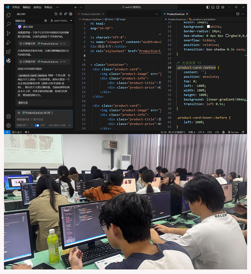 《网页设计基础》是电子商务专业的专业基础课程,对接电商视觉设计师、新媒体设计师等岗位需求。课程聚焦网页设计原理与核心工具的掌握,培养学生独立完成电商及新媒体平台的视觉页面设计与开发。在“VS Code +通义灵码,高效构建电商网站前端页面”教学模块中,花湖临空经济学院帅晓华老师采用“智能辅助,双轨并进”的实战教学法:学生通过VS Code夯实前端编码基础,借助通义灵码辅助电商页面开发,提升代码规范性与开发效率、强化质量意识;同时将思政元素有机融入教学全过程,增强学生的岗位实战能力与竞争力。