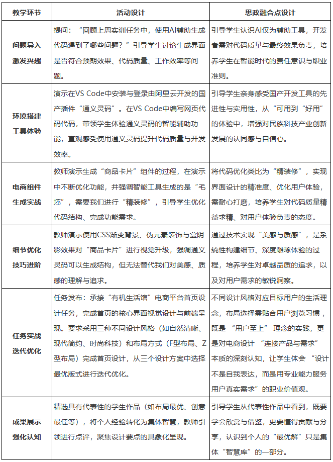 课程构建思政元素与教学环节的深度耦合机制,把价值引领的导向性要素嵌入教学设计的各个环节,摒弃生硬说教的单向灌输模式。通过将思政元素融入教学活动设计,依托实操任务自然渗透,使学生在掌握前端开发技能的同时,潜移默化地形成符合行业要求的职业伦理与价值取向,实现技能培育与价值塑造的协同共进。