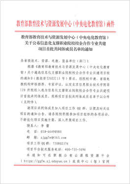 本网讯(通讯员郭娟)近日,教育部教育技术与资源发展中心(中央电化教育馆)公布了“信息化支撑职业院校校企合作专业共建项目首批共同体成员”名单,长江职业学院成功入选,全国首批共同体成员仅有120家。为贯彻国务院《国家职业教育改革实施方案》和教育部、国家发展改革委等九部门联合印发的《职业教育提质培优行动计划(2020--2023年)》精神,践行职业教育数字化战略行动,以信息化带动职业教育现代化。2022年5月,教育部教育技术与资源发展中心(中央电化教育馆)组织信息化支撑职业院校校企合作专业共建项目校遴选工作,该项目基于职教公有云课程资源平台,协同建设国家和院校两级资源中心、虚拟仿真实习实训中心,具体实施以下任务:建设与应用课程资源;实施混合云在线实训;创设多元化教学方式;提升“双师型”教师能力;探索校企合作模式;开放共享成果资源。