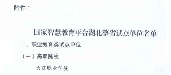 长职新闻网讯 日前,根据《省教育厅办公室关于公布国家智慧教育平台湖北整省试点单位的通知》(鄂教科办函〔2022〕16号),长江职业学院入选首批国家智慧教育平台湖北整省试点单位。