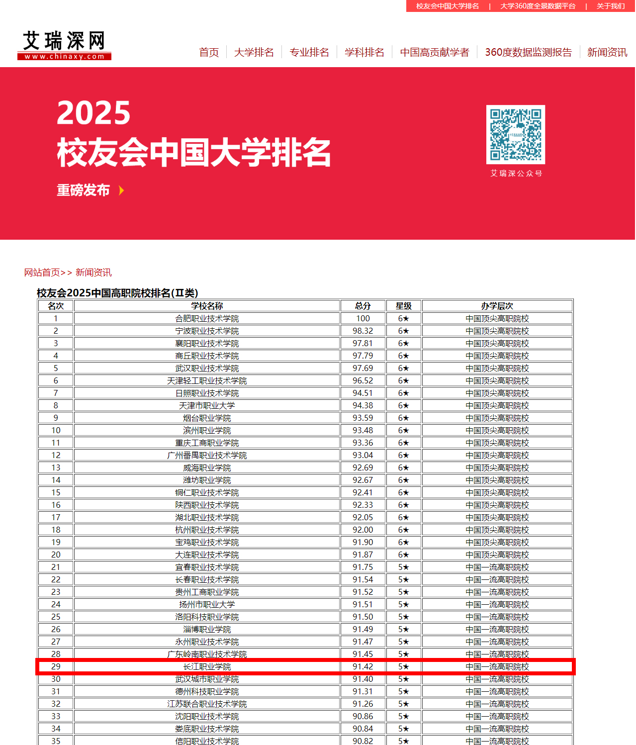 (长职新闻网讯)2025年1月6日,全国第三方大学评价研究机构艾瑞深校友会网(Cuaa.net)正式发布了备受瞩目的校友会2025中国大学排名。在本次排名中,长江职业学院凭借出色的综合表现,成功入选2025中国高职院校排名(II类)第29名,较2024年的第32名又前进了3名,展现了学校持续攀升的实力和影响力。
