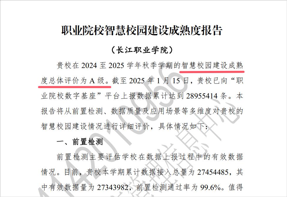 (转载自长职新闻网) 2025年2月17日,教育部教育管理信息中心发布《职业院校智慧校园建设成熟度报告》,长江职业学院智慧校园建设成熟度总体评价为A级,标志着我校智慧校园建设工作取得新突破。