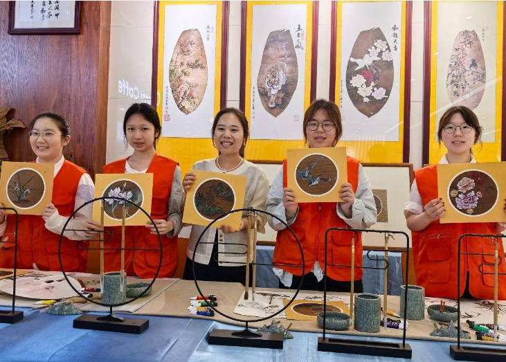 “非遗+文创”让传统与创新相融合。汉绣传承人穿针引线,金丝银线在绸缎上绽放凤凰、樱花。城市建设学院大学生以叶为纸,在叶面上绘制出颇有韵味的叶画。缠花技艺与现代首饰设计巧妙结合,绒花胸针刚展出,就有不少师生提出想要购买,艺术设计学院服装设计专业教研室主任杨帅介绍:“我们正在开发非遗体验课程包,让传统文化走进中小学课堂。”