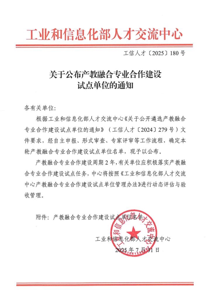 (长职新闻网讯)近日,工业和信息化部人才交流中心发布《关于公布产教融合专业合作建设试点单位的通知》,我校获批“产教融合专业合作建设试点单位”,数据信息学院计算机应用技术专业入选试点专业。此次全国共有143所高职院校的专业入选,湖北省高职院校仅有5所。