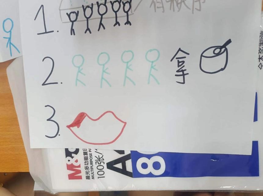 最后一个环节,金老师要求学生“绘制幼⼉常规示意图”。两⼈⼀组,在幼⼉⼀⽇活动中任选⼀个环节或⼀个场景,以图⽂并茂的示意图式,绘制出在该环节或场景中对幼⼉的常规要求,并做简要说明。
