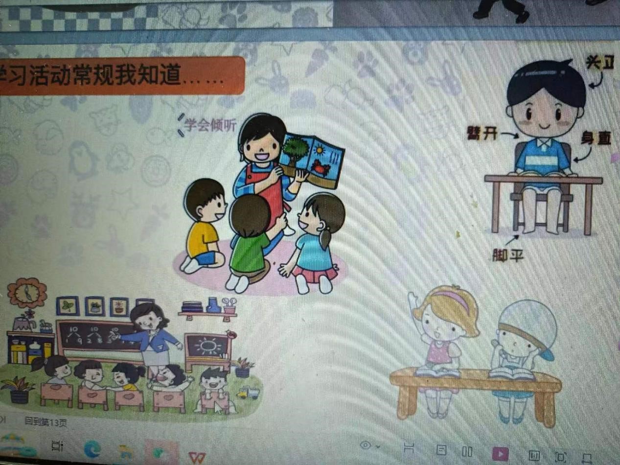 二、你言我语---议一议,说起来。金老师在课堂上紧密结合幼儿园班级管理实际,注重案例教学,引用了丰富多样的教学资源,如视频《小班幼儿一日常规》、儿歌《我和规则交朋友》、儿童诗《我们知道在幼儿园应该怎样做》、绘本《不良坐姿危害大》、案例《小脚印告诉我应该怎么做》……,形象生动地呈现了幼儿园班级常规管理实践,营造了轻松愉悦的学习氛围,并引导学生在看一看、说一说、议一议等多样化的互动中,认识了幼儿园班级常规的类型,理解了班级常规管理的意义、掌握了班级常规管理的方法和策略。