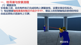 (3)做:边学边做,教师讲解柱吊装与安装5个流程施工技术及质量控制要点,展示“测量放线要点”组图,展示“铺设座浆料”特写图与高清照片,展示“柱构件吊装”示意图,展示“定位校正和临时固定”高清照片,展示“钢筋套筒灌浆施工” 高清照片,并进行重点讲解。针对测量放线、铺设座浆料、柱构件吊装、定位校正和临时固定、钢筋套筒灌浆施工五个内容的要点,发布题目,学生线上抢答,完成课内练习与模拟实操。