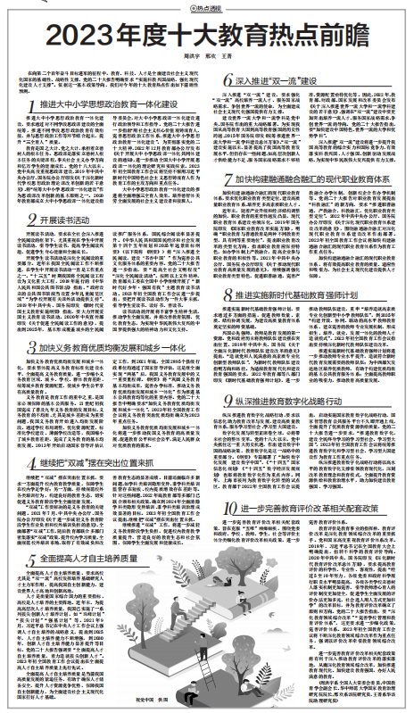 在向第二个百年奋斗目标进军的征程中,教育、科技、人才是全面建设社会主义现代化国家的基础性、战略性支撑,党的二十大报告明确要求“实施科教兴国战略,强化现代化建设人才支撑”。依据这一基本政策导向,我们对今年的十大教育热点作出如下前瞻性预测。